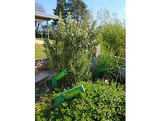 Auch wenn das Schulgebäude momentan noch leer ist, regt sich das Leben rund um den HG-Schulteich. Die im November letzten Jahres von der Klasse 6a eingepflanzen Obstbäume zeigen bereits die ersten grünen Knospen. Und auch im Kräuterbeet vor der Schulküche blüht der Rosmarin prächtig.