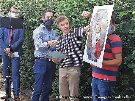 Bei der feierlichen Verlegung des Stolpersteins haben auch Schüler und Lehrer des HG mitgewirkt. Julius Keller, Kl. 9, hat in seinem Text „Eine Begegnung mit Max Reeb“ von der Spurensuche nach dem Kirchenmaler erzählt und ein Deckengemälde vorgestellt, das in der ehemaligen Schlosskapelle in Rötlen zu finden ist.